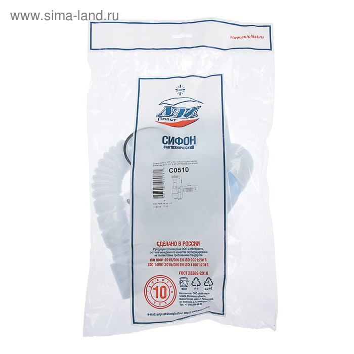 Сифон для мойки "АНИ Пласт" C0510, 1 1/2"х40 мм, литой выпуск, с гофрой 40x50 мм