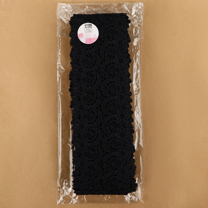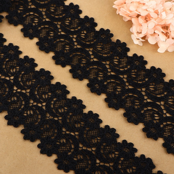 Кружево гипюровое, 65 ± 5 мм × 6,8 ± 0,5 м, цвет чёрный