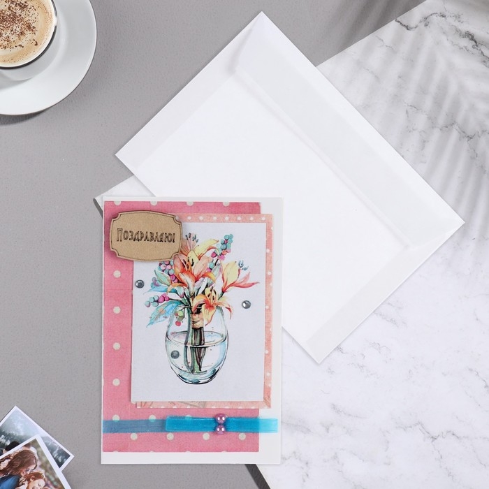 Открытка "Поздравляю!" ручная работа, ваза, 11,5х17 см