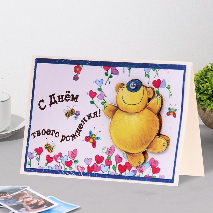 Открытка "С Днём твоего Рождения!" ручная работа, мишка, 11,5х17 см