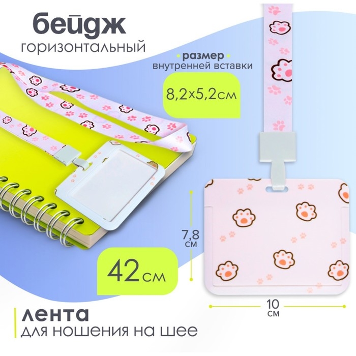 Бейдж горизонтальный внешний размер 10 х 7,8 см, внутренний размер 5,2 х 8,2 см, лента 42 см, с рисунком "Лапки"