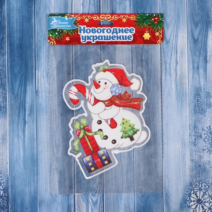 Наклейка на стекло "Снеговик с леденцом и подарками" 9х14 см