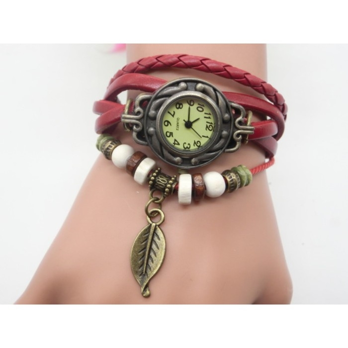 Утонченный и изящный дизайн наручных часов подчеркнет ваш безукоризненный вкус в любой ситуации и дополнит образ. Красивые винтажные часы с подвеской на кожаном плетёном ремешке для прекрасных дам любого возраста. Работают от батарейки типа "таблетка", которой хватает на долгое время. Ремешок украшен деревянными бусами и акрилом.
