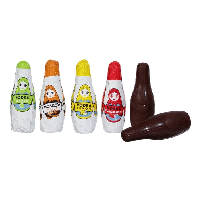 Шоколадные бутылочки из Франции станут отличным и вкусным подарком для ваших родных и близких. Попробуйте фигурки из темного шоколада с терпкими и фруктовыми начинками водки и ликеров: яблоко, клюква, лимон; вкус которых раскрывается постепенно, где согревающее терпкое ощущение начинки перекликается с насыщенным шоколадным послевкусием.