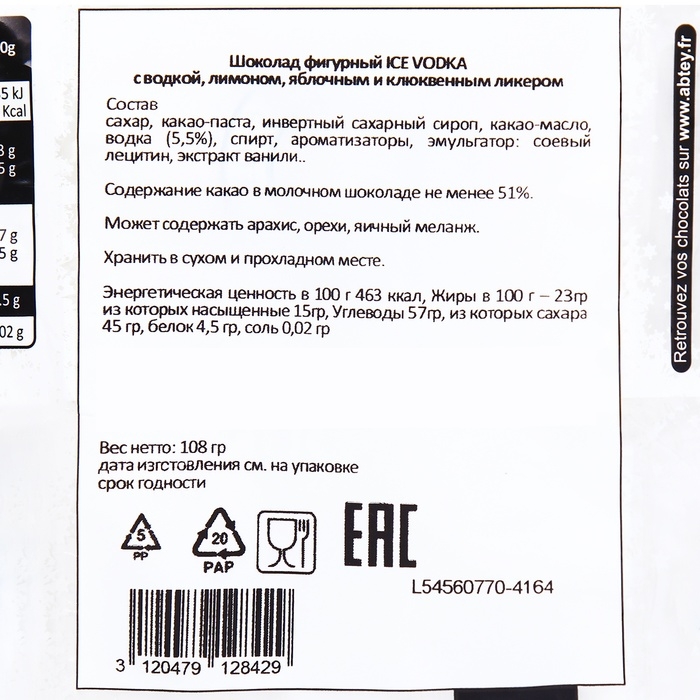 Новый год. Шоколад фигурный ICE VODKA с водкой, лимоном, яблочным и клюквенным ликером, 9 г