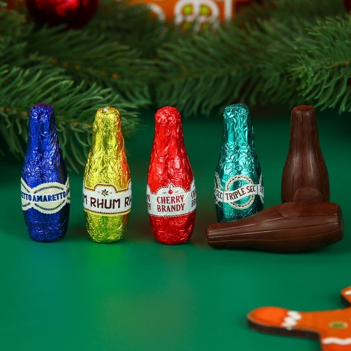Шоколадные бутылочки из Франции станут отличным и вкусным подарком для ваших родных и близких. Попробуйте фигурки из темного шоколада с популярными вкусами рома: амаретто, черри бренди, трипл сек; вкус которых раскрывается постепенно, где согревающее терпкое ощущение начинки перекликается с насыщенным шоколадным послевкусием.