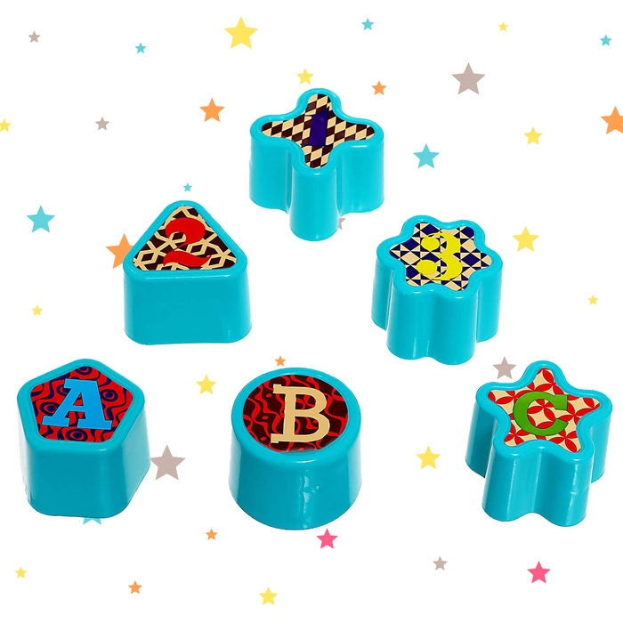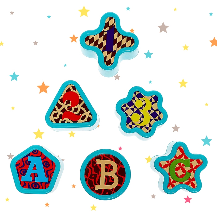 - На фигурах изображены картинки с изображением разных узоров, букв и цифр. Яркие насыщенные цвета привлекают внимание.