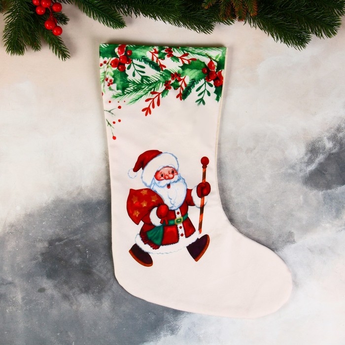 Носок для подарков "Дед Мороз с посохом, в лесу" 26х40 см, белый