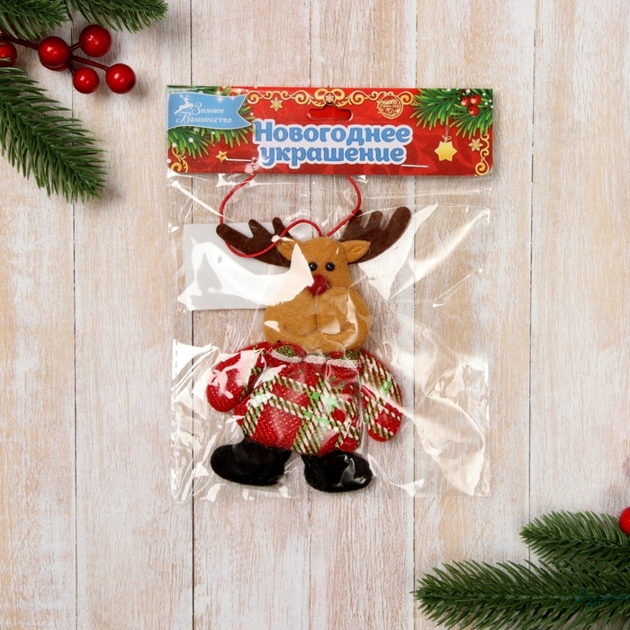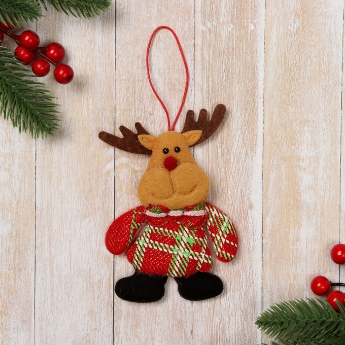 Мягкая подвеска "Олень в клетчатом костюме" 7х9 см, красный