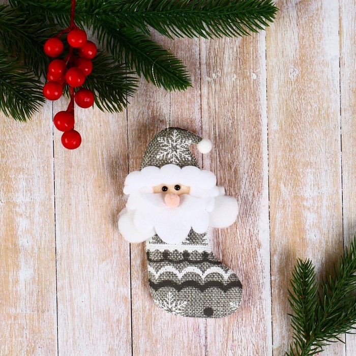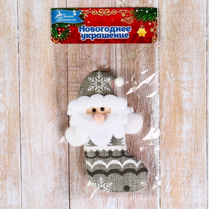 Мягкая подвеска "Дед Мороз в костюмчике с орнаментом лес в носке" 7х13 см, серый
