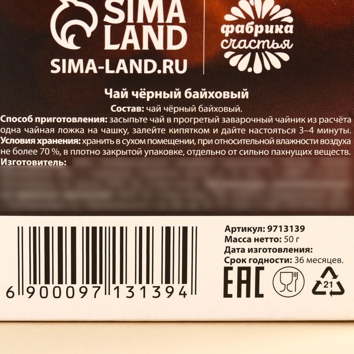 Состав: чай чёрный байховый. Способ приготовления: засыпьте чай в прогретый заварочный чайник из расчёта одна чайная ложка на чашку, залейте кипятком и дайте настояться 3-4 минуты.
