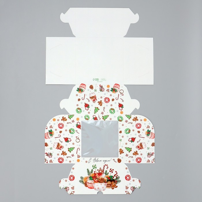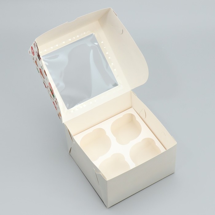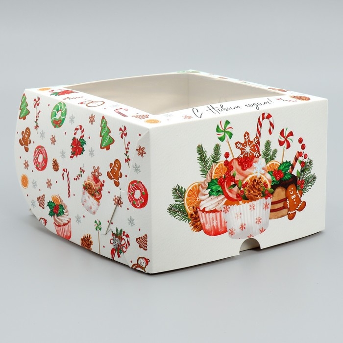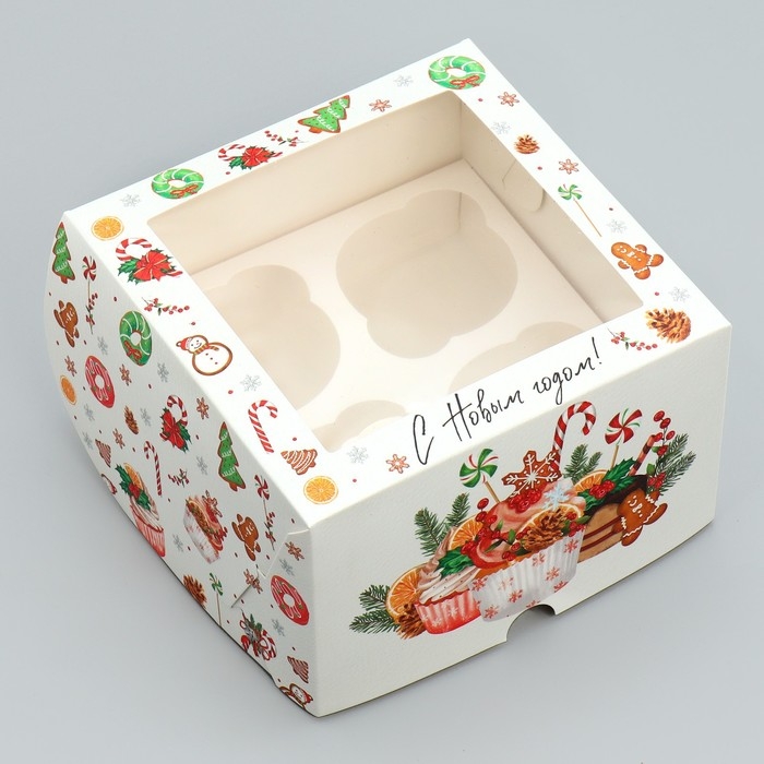 Коробка складная на 4 капкейка с окном «С Новым годом!», сладости, 16 х 16 х 10 см, Новый год
