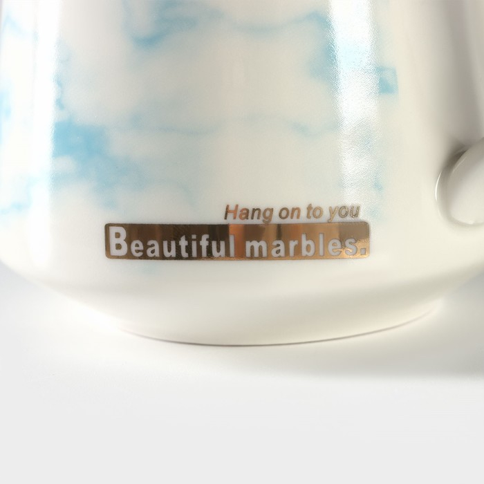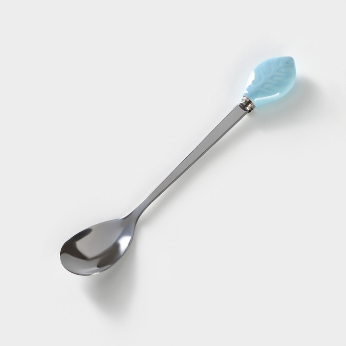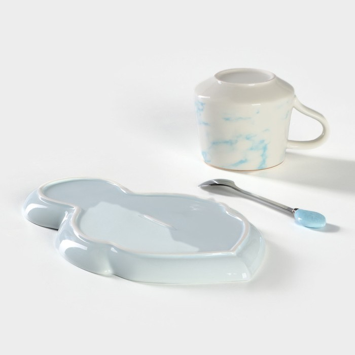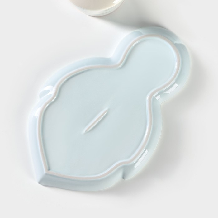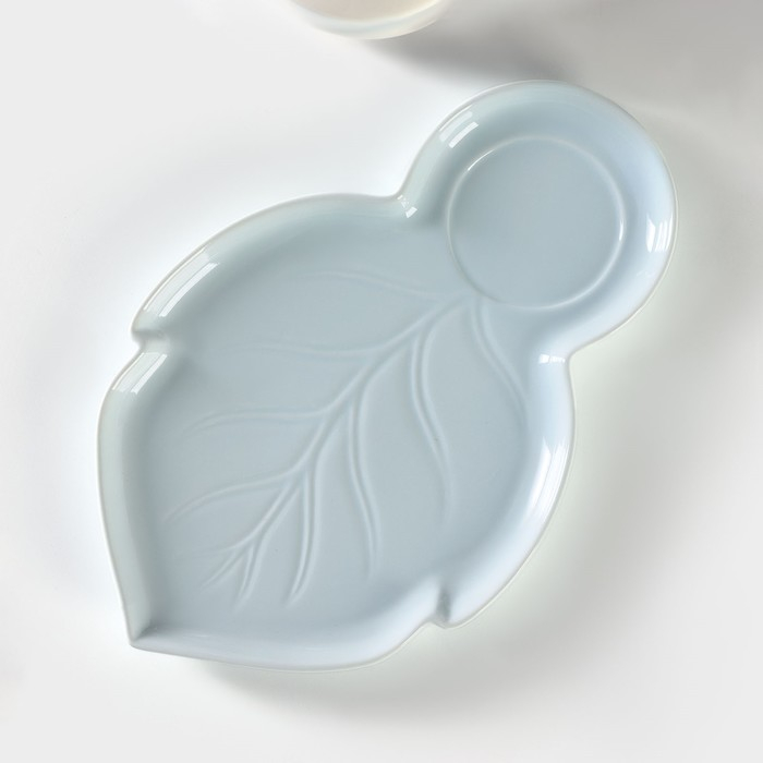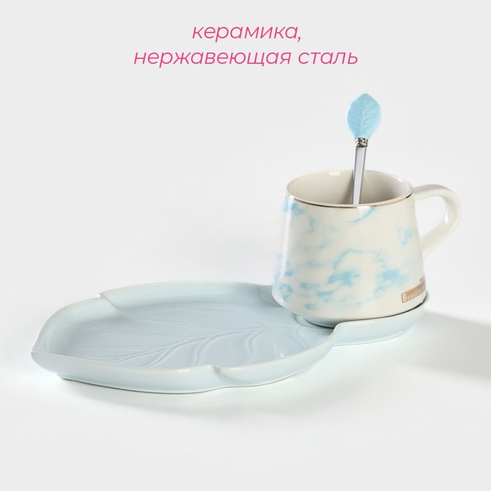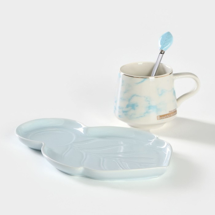 Чайная пара керамическая «Листочек», 3 предмета: чашка 320 мл, блюдце 25,5×16 см, ложка, цвет голубой