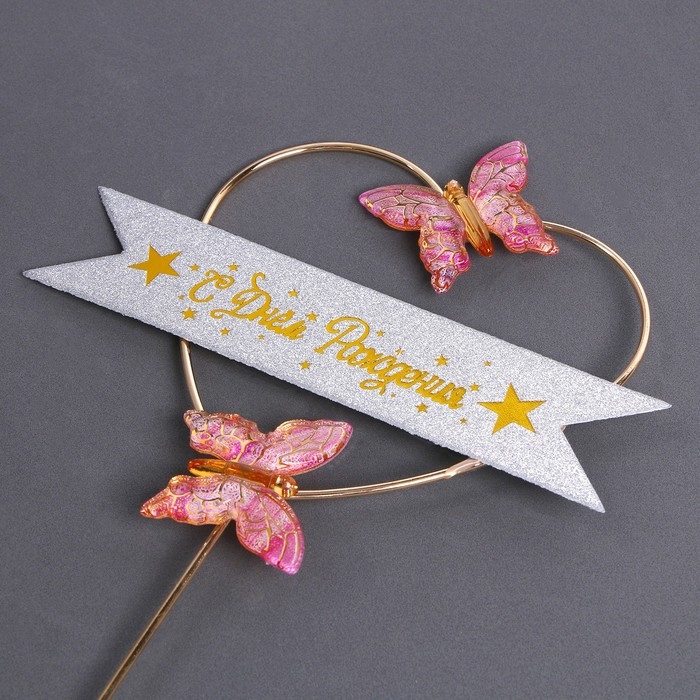 Топпер «С днём рождения», бабочки в сердце, цвет розовый