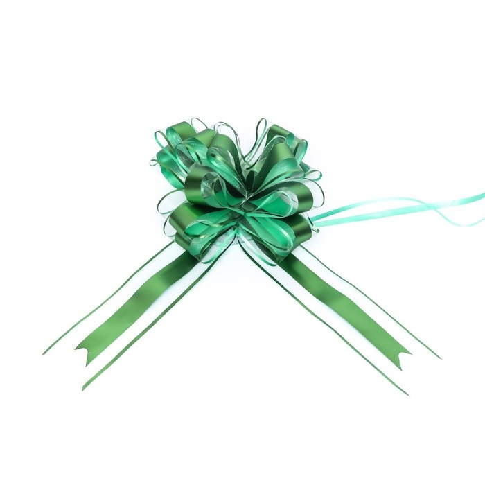 Для того чтобы собрать бант, надо потянуть за две ленточки, находящиеся между широкими лентами, удерживая широкие ленты в месте спайки. Бант собирается за несколько секунд.