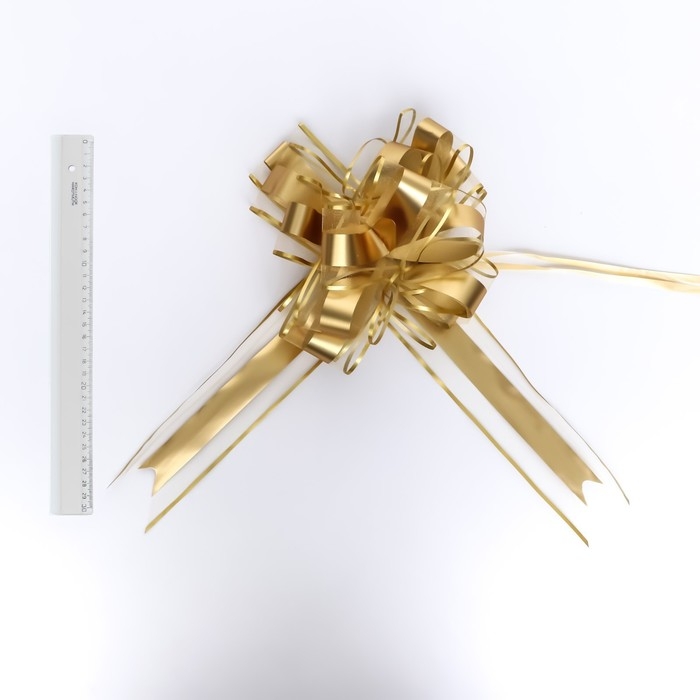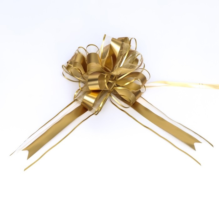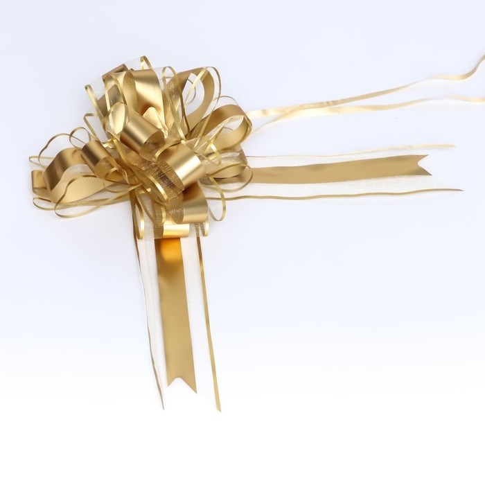 Для того чтобы собрать бант, надо потянуть за две ленточки, находящиеся между широкими лентами, удерживая широкие ленты в месте спайки. Бант собирается за несколько секунд.