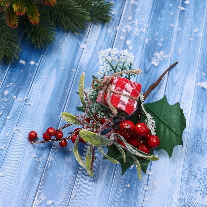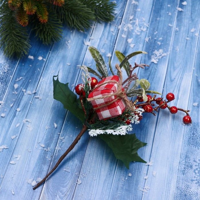 Декор "Зимние грезы" подарок в клетку листья ягоды, 20 см
