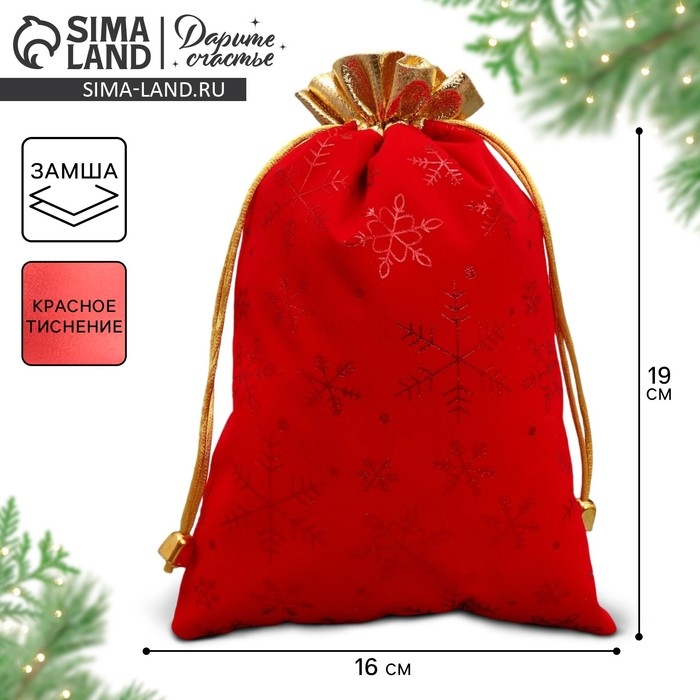 Мешочек подарочный замша «Подарочки с душой», снежинки, тиснение, 16 х 24 см +/- 1.5 см, Новый год