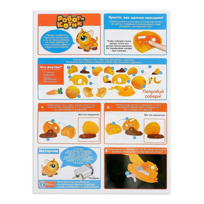 С набором торговой марки «Эврики» ребёнок соберёт весёлое животное и с удовольствием поиграет с ним. Питомец умеет ходить, прыгать, очень любит морковку. Внутри у него есть сенсор, распознающий магниты.