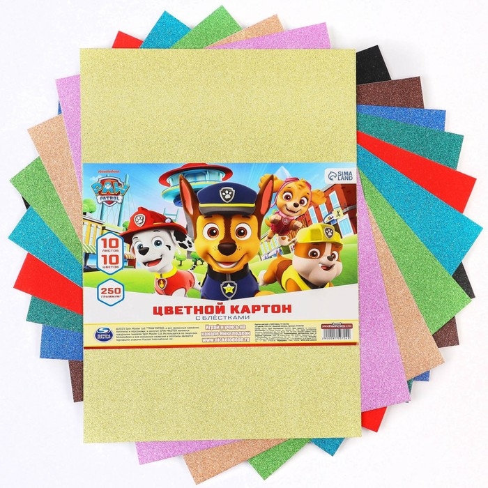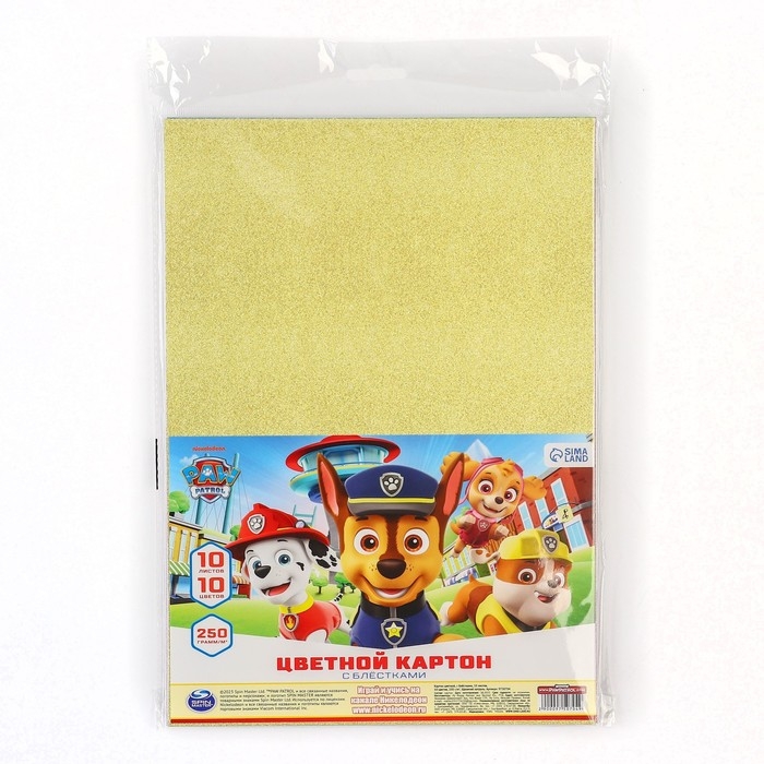 Картон цветной с блёстками, А4, 10 листов, 10 цветов, немелованный, односторонний, в пакете, 250 г/м², Щенячий патруль