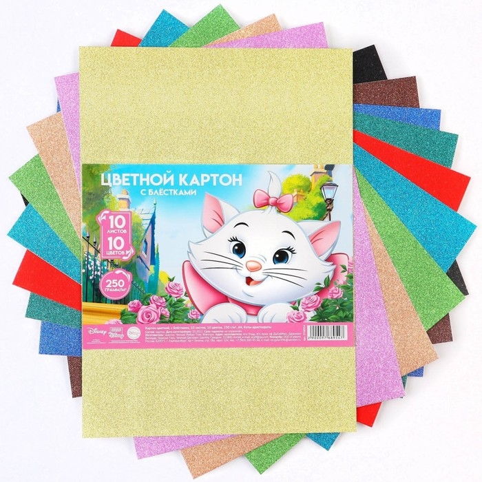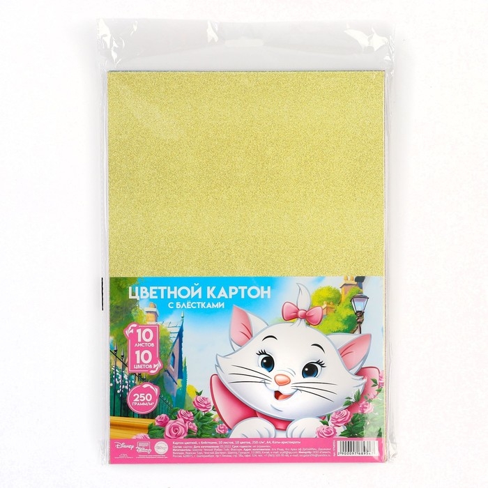 Картон цветной с блёстками, А4, 10 листов, 10 цветов, немелованный, односторонний, в пакете, 250 г/м², Коты Аристократы