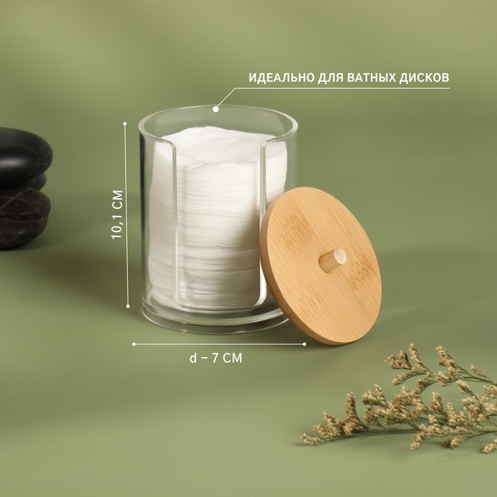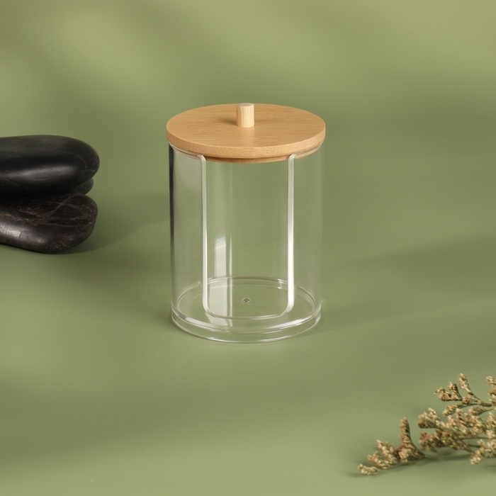 Органайзер для хранения ватных палочек «BAMBOO», с крышкой, d = 9,5 × 9,7 см, в картонной коробке, цвет прозрачный/коричневый