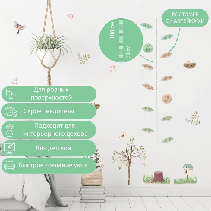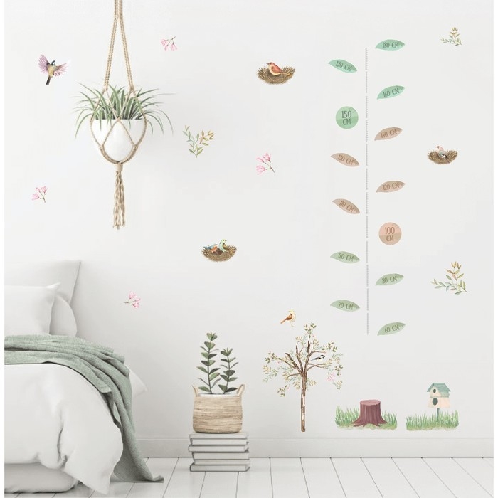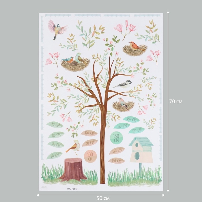 Наклейка интерьерная цветная ростомер "Птицы в гнёздах на дереве" 50х70 см
