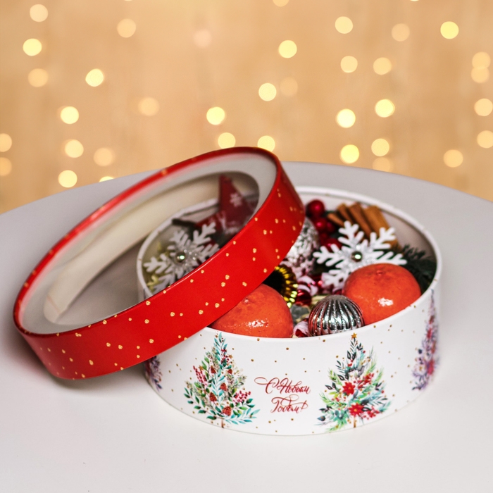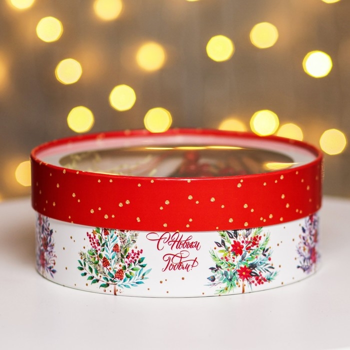 Новый год. Коробка подарочная новогодняя для макарун тубус с окном "Новогодние ёлочки" 21 х 21 х 8 см.