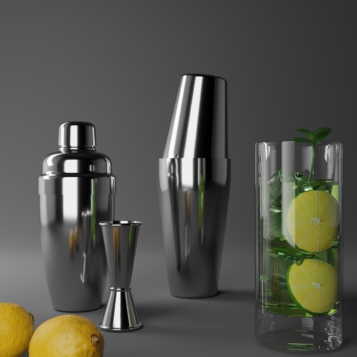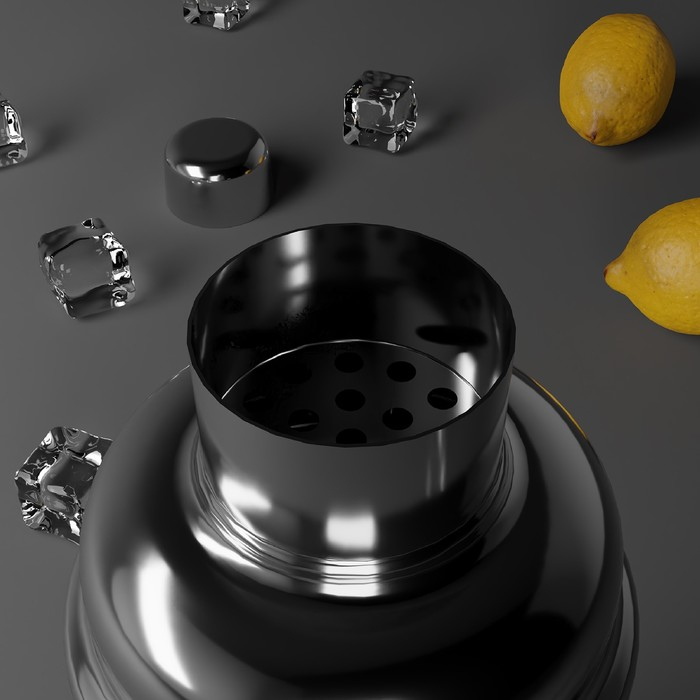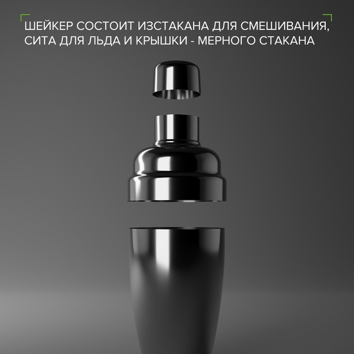 Шейкер изготовлен из качественной нержавеющей стали, состоит из стакана для смешивания, сита для льда и крышки — мерного стакана.