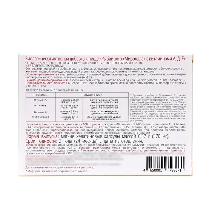 Витатека Рыбий жир с витамином А, D, E - это биологически активная добавка, разработанная для поддержания здоровья и обогащения организма важными жирными кислотами и витаминами. Капсулы содержат рыбий жир, а также витамины А, D и E, которые играют важную роль в поддержании общего физического благополучия.