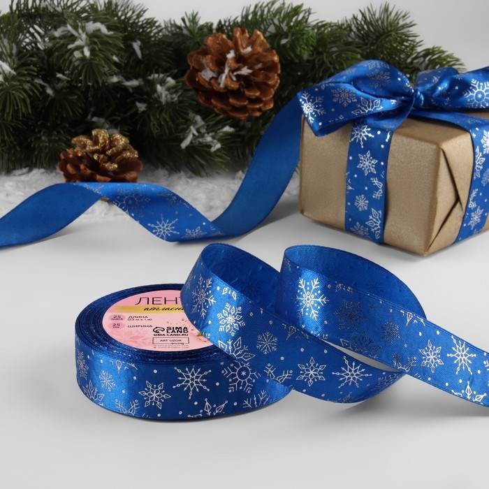 Новый год! Лента атласная с тиснением «Снежинки», 25 мм, 23 ± 1 м, цвет синий/серебряный №122