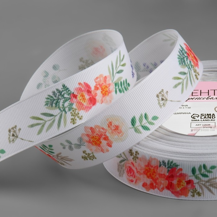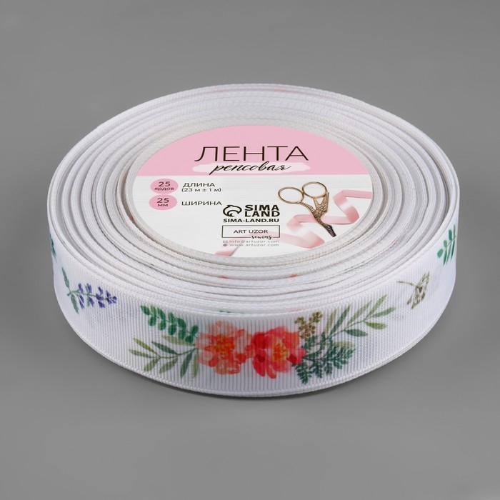 Лента репсовая «Пионы», 25 мм, 23 ± 1 м, цвет белый