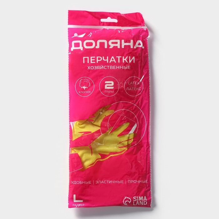 Перчатки хозяйственные Доляна, 2 пары, размер L, ХБ напыление, латексные, цвет жёлтый