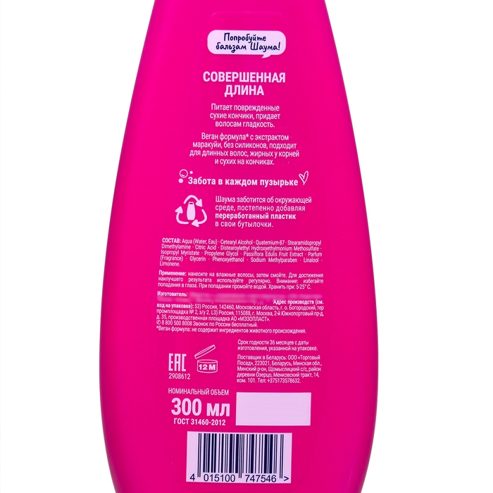 Бальзам Шаума Совершенная длина с экстрактом маракуйи для длинных волос разглаживает и питает структуру волос, питает повреждённые сухие кончики, придаёт волосам гладкость. Веган-формула с экстрактом маракуйи без силиконов, подходит для длинных волос, жирных у корней и сухих на кончиках. Шампунь для волос "Совершенная длина" с экстрактом маракуйи интенсивно восстанавливает поврежденные волосы, наполняя их силой и блеском. Не содержит парабенов и силиконов, качественно очищает, не пересушивая волосы. Образует обильную пену и имеет приятный летний фруктовый аромат. Результат – здоровые волосы, легкое расчесывание и блеск после нескольких применений. Подходит для жирных у корней и сухих на кончиках волос.