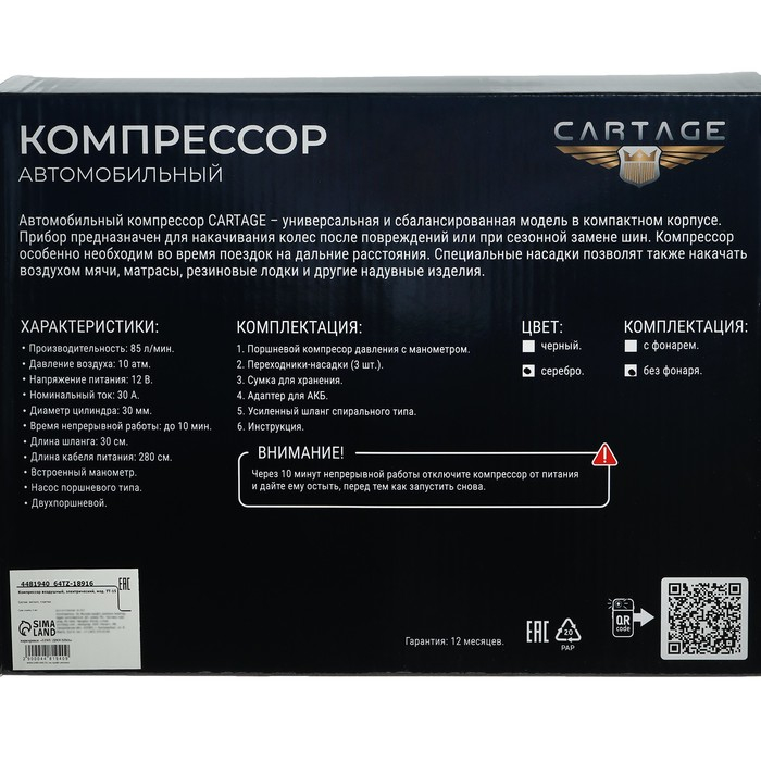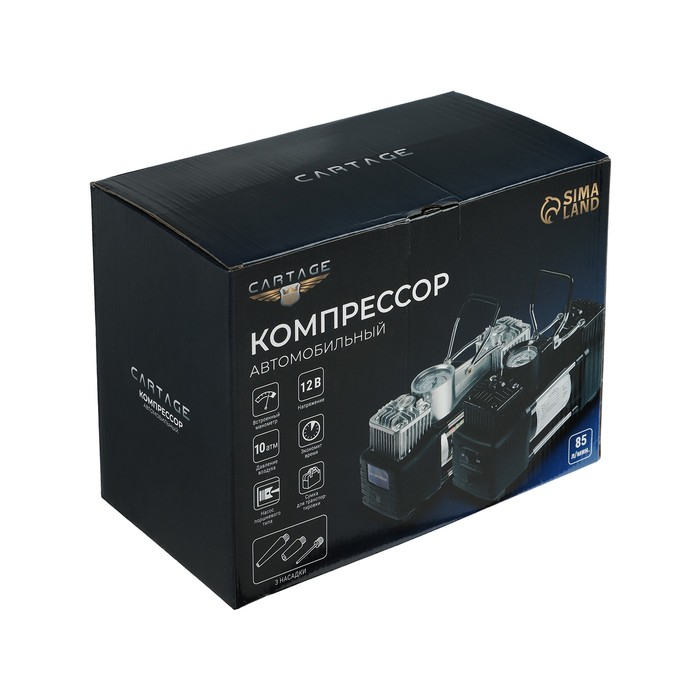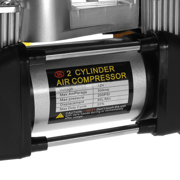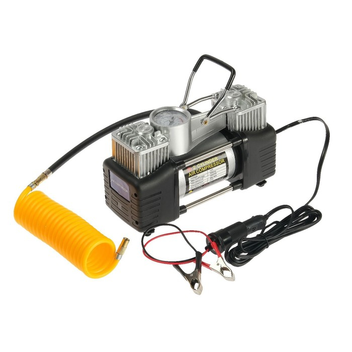 Мощный 2-х поршневой цельно-металлический автомобильный воздушный компрессор. Подключается к аккумулятору с помощью зажимов «крокодил». Обладает производительностью 85л/мин, что позволяет без труда накачивать шины не только легковых автомобилей, но и различного коммерческого транспорта, в том числе грузового, массой до 3,5 т.