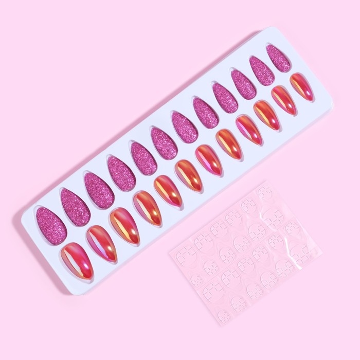 В наборе с накладными ногтями идут клеевые пластины. За счёт этого уменьшается вероятность механического травмирования природного ногтя. Клеевые пластины безопасны в применении и не вредят натуральным ногтям, в отличие от клея. Клей содержит составе высокую токсичность, что может сказаться на вашем организме.