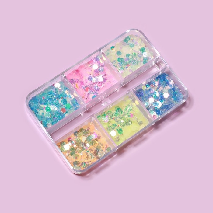 Пайетки для декора ногтей, 6 ячеек, разноразмерные, светятся в темноте, разноцветные