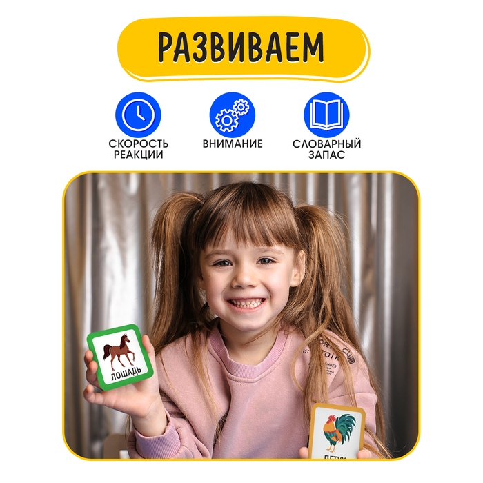 - Задача ребёнка — быстро выбрать нужную карточку, и дать как можно больше правильных ответов.