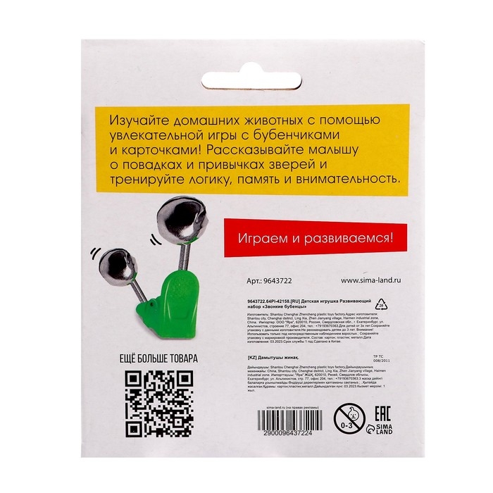 Развивающий набор «Звонкие бубенцы» познакомит малышей от 3 лет с домашними животными, а также поможет потренировать логику, память и внимательность. Рассказывайте малышу о повадках и привычках зверей с помощью увлекательной игры с бубенчиками и карточками.