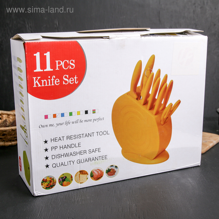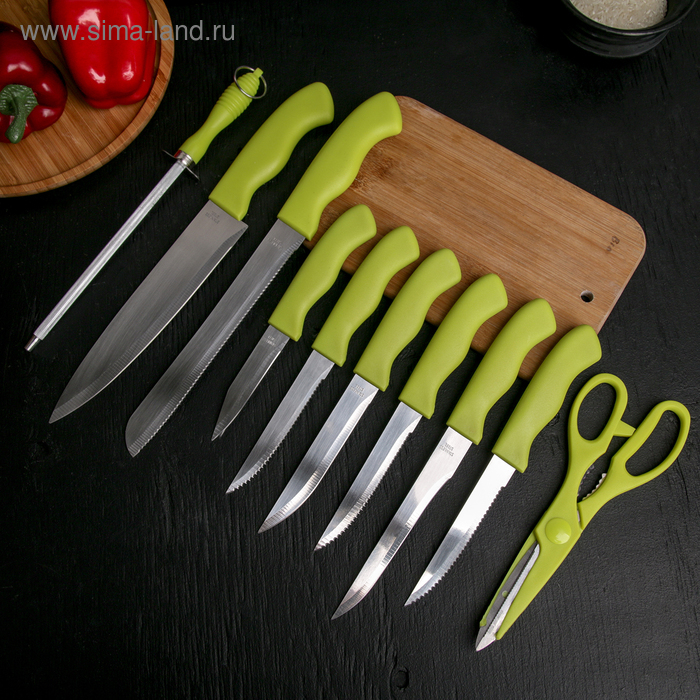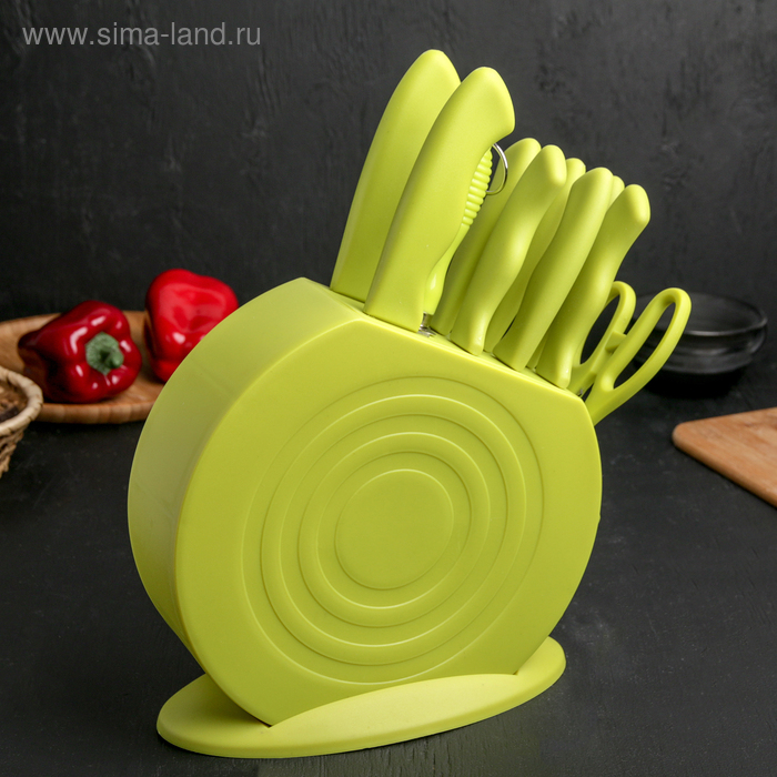 Набор ножей кухонных на подставке, 8 ножей, ножеточка, ножницы, цвет зелёный
