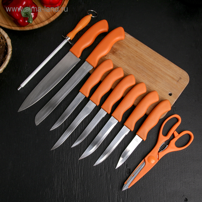Набор ножей кухонных на подставке, 8 ножей, ножеточка, ножницы, цвет оранжевый
