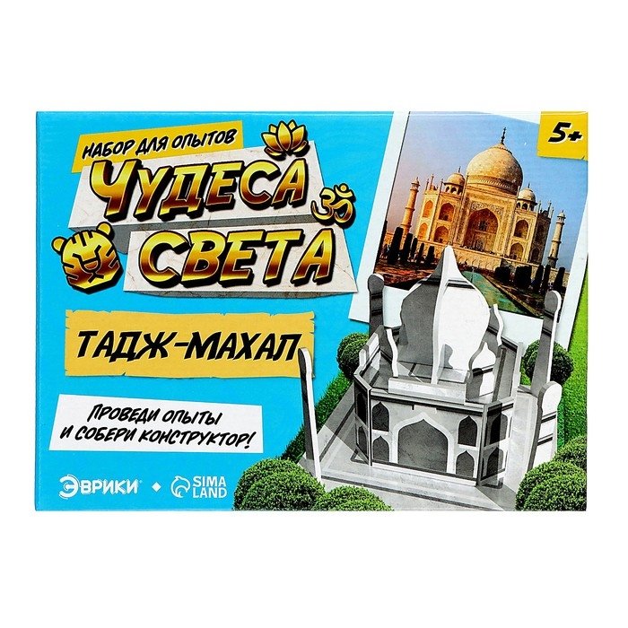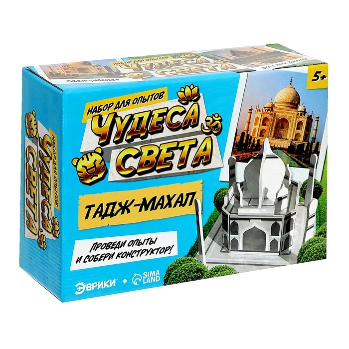 С набором для опытов «Чудеса света. Тадж-Махал» ребёнок своими руками соберёт модель дворца в индийском городе Агра, узнает интересные факты о нём, а также проведёт 2 увлекательных опыта.