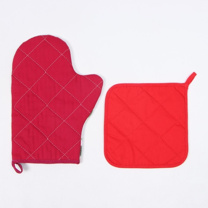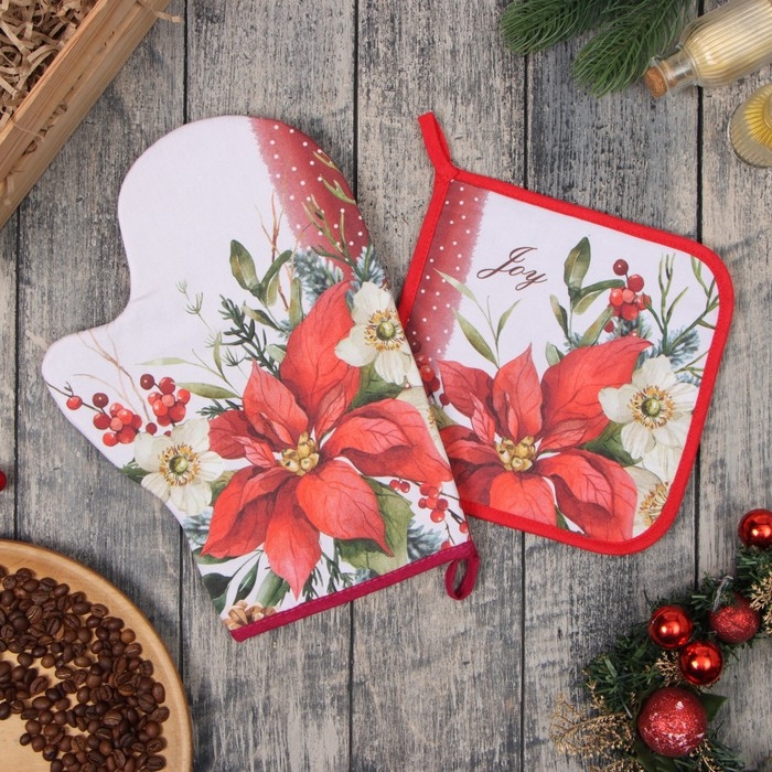 Новый год. Набор кухонный Этель "Пуансеттия": прихватка 19х19 см, варежка-прихватка 20х28 см, 100% хл