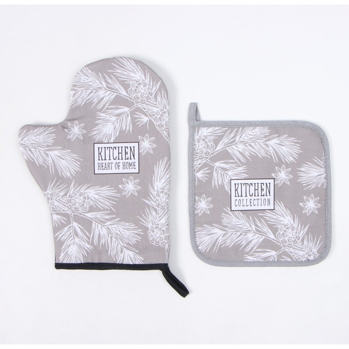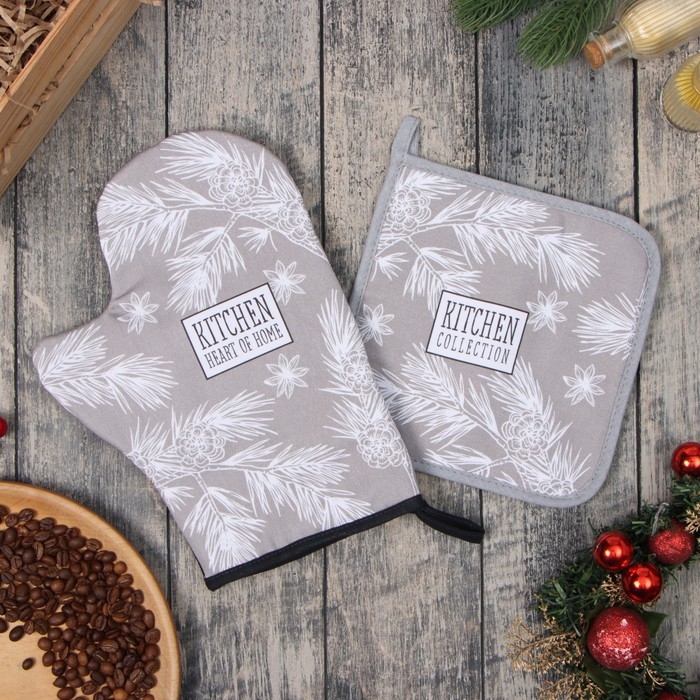 Новый год. Набор кухонный Этель "Рождественские ветки": прихватка 19х19 см, варежка-прихватка 20х28 см, 100