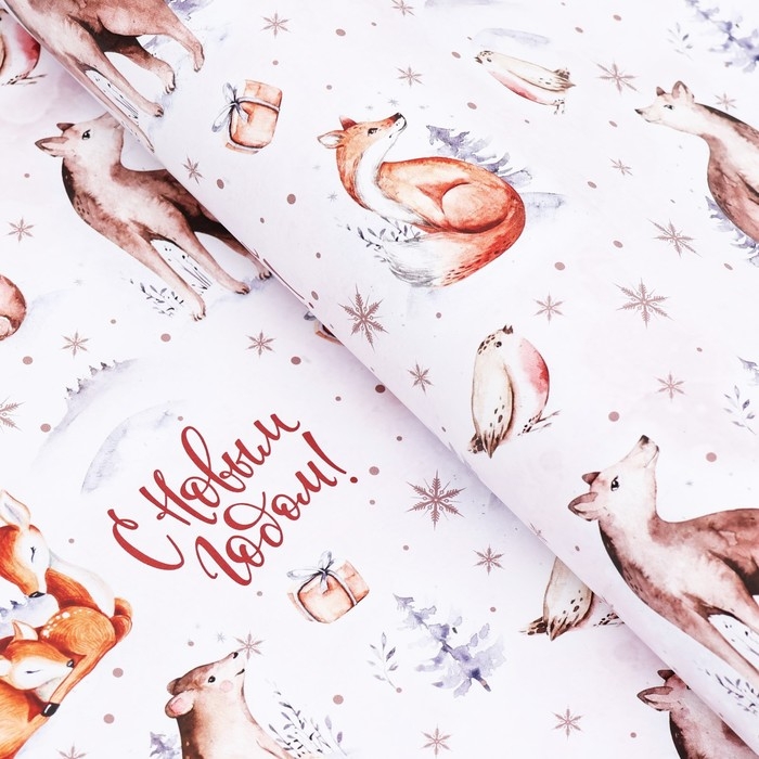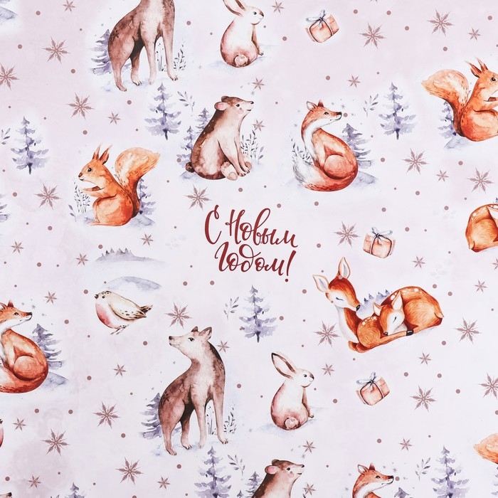 Новый год. Бумага упаковочная глянцевая "Зверята ", 70 х 100 см,1 лист,