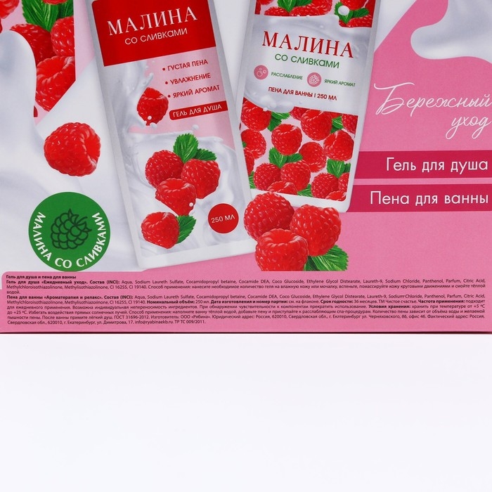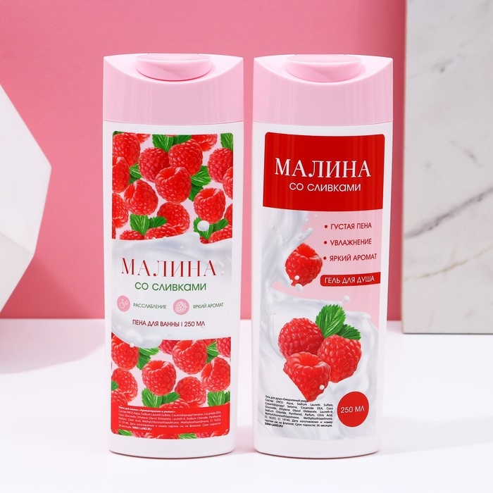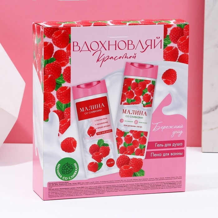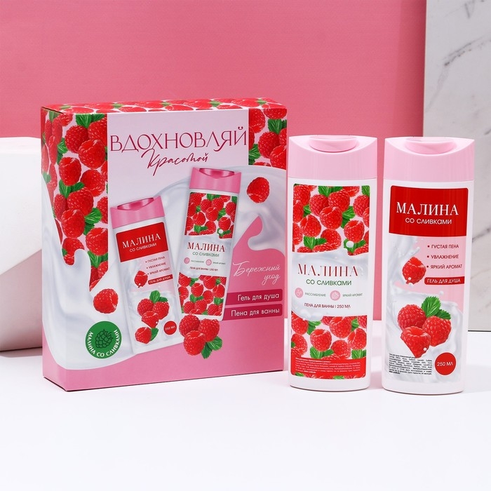 Подарочный набор косметики «Вдохновляй красотой!», гель для душа и пена для ванны, 2 х 250 мл, аромат малины со сливками, ЧИСТОЕ СЧАСТЬЕ