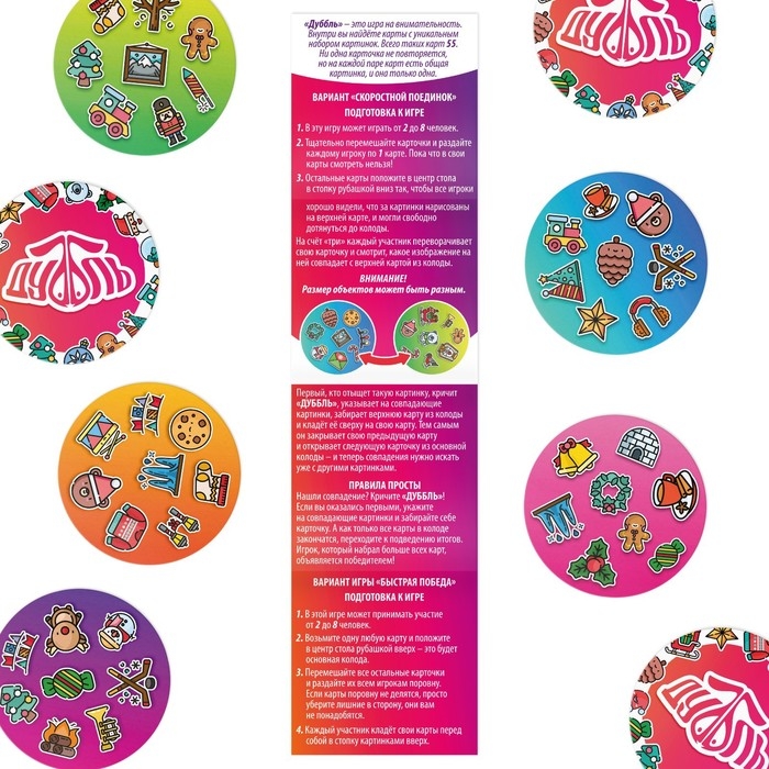 Внутри карты с уникальным набором ярких картинок. На каждой паре карт есть общее изображение. Находите совпадения быстрее всех и побеждайте!