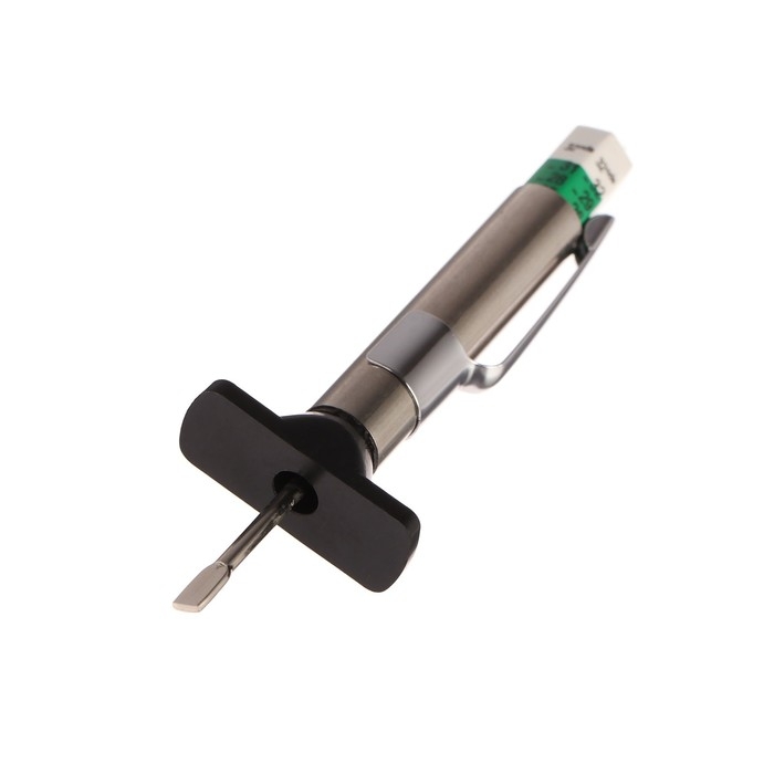 Измеритель толщины остатка протектора механический - это простой и надежный инструмент для определения износа шин. Он состоит из металлического корпуса с измерительной шкалой и подвижного указателя, который опускается в протектор при нажатии на кнопку. С помощью этого устройства можно быстро и точно определить остаточную глубину протектора в миллиметрах, что позволяет своевременно заменить или отремонтировать шины.