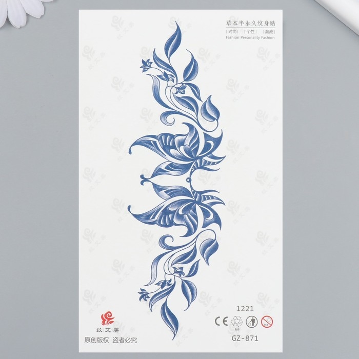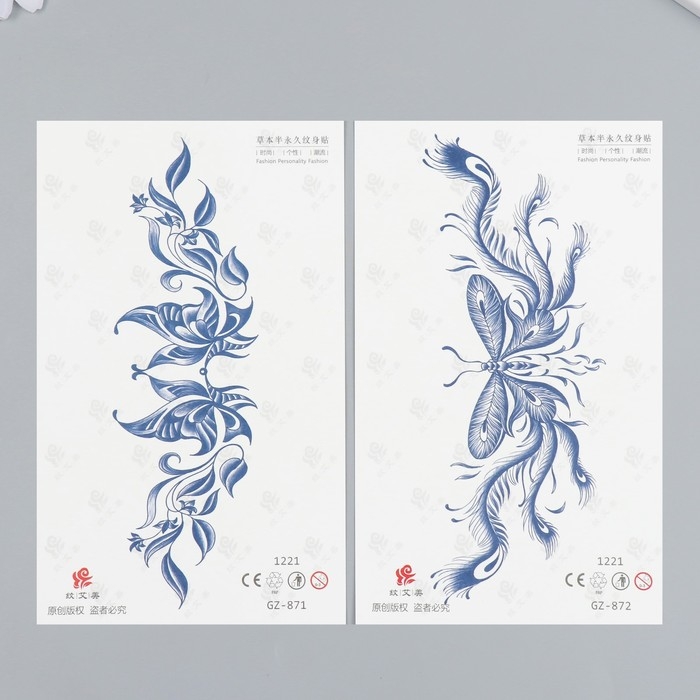 Татуировка на тело синяя "Бабочка с перьями" 18х11 см МИКС