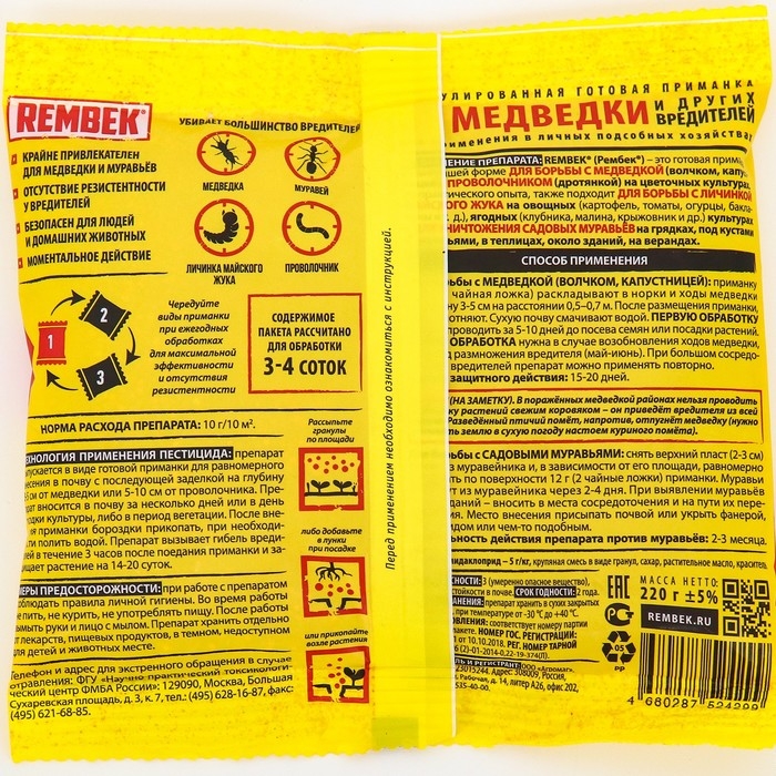 Средство от медведки Рембек микрогранула - высокоэффективное средство для защиты сельскохозяйственных культур от медведки и проволочника с особо привлекательным для вредителей вкусом и запахом. Обладает 100% эффектом уничтожения насекомых, их яиц и личинок. Данная форма препарата, за счет мелкой фракции, позволяет обработать большую площадь, по сравнению с другими видами.
